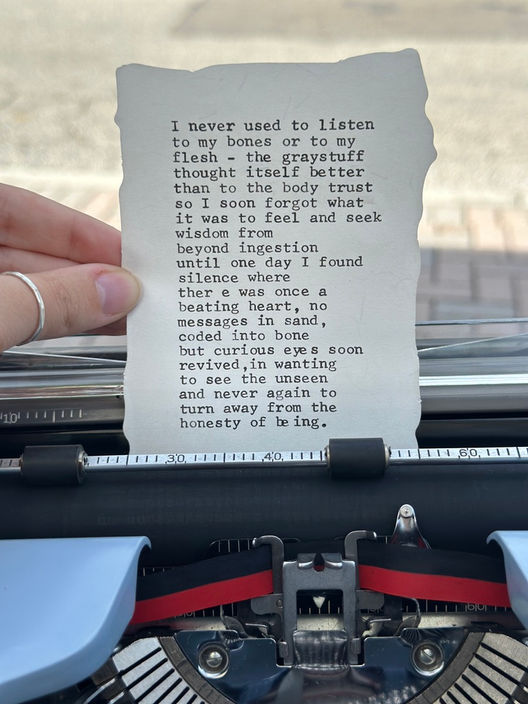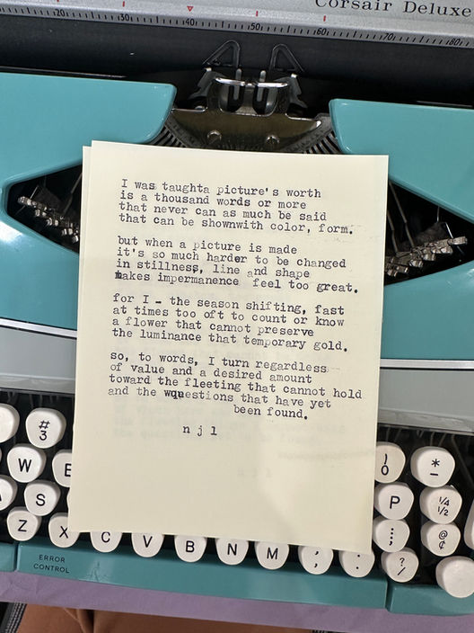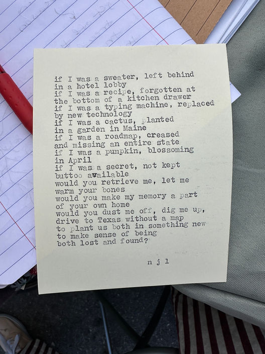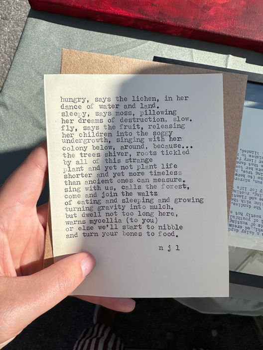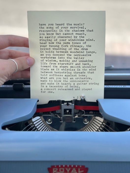 I bring poetry to weddings, fundraisers, events, and celebrations of all shapes and sizes - literally any gathering can benefit from being activated by live poetry! I write verse in real time, capturing the moments, emotions, and essence of the day as it unfolds through the typewriter onto the page. The resulting original poems are one-of-a-kind, intuitive, reflective. I’ve had poems speak to the very depths of who someone is, even though we only spoke for a moment before I began to write.